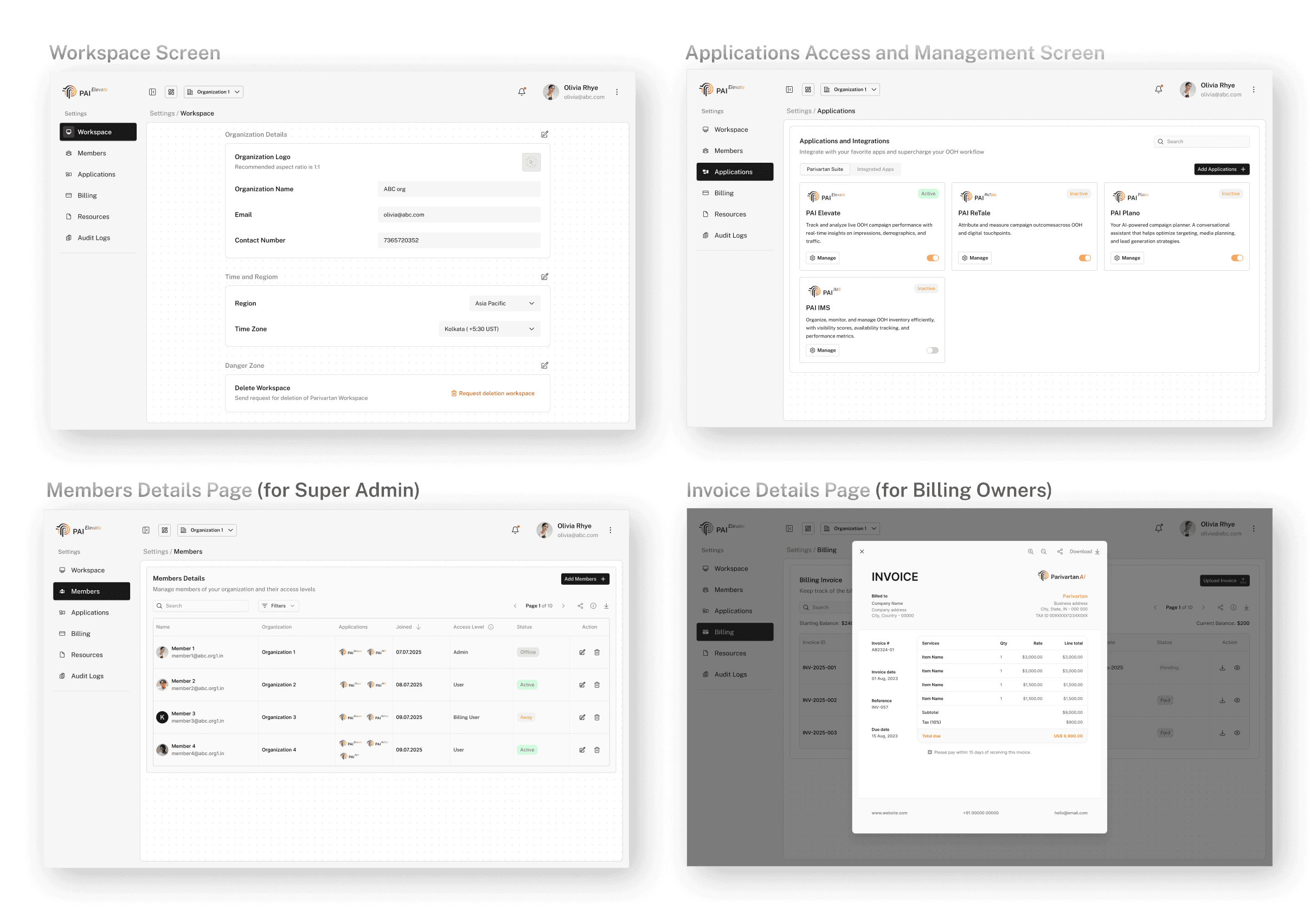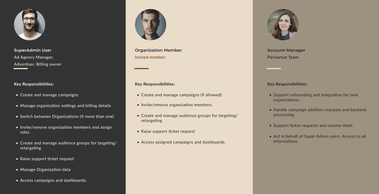 Introducing clear role-based access controls (SuperAdmin, Invited Members, Account Managers) and scalable permissions within the dashboard. This allowed agencies, advertisers, and billing owners to manage their own organizations while still collaborating with invited team members, and ensured backend account managers from Parivartan could provide oversight and support without interfering with day-to-day operations. The design created a flexible, scalable structure that adapts seamlessly to diverse user groups while maintaining clarity and control.