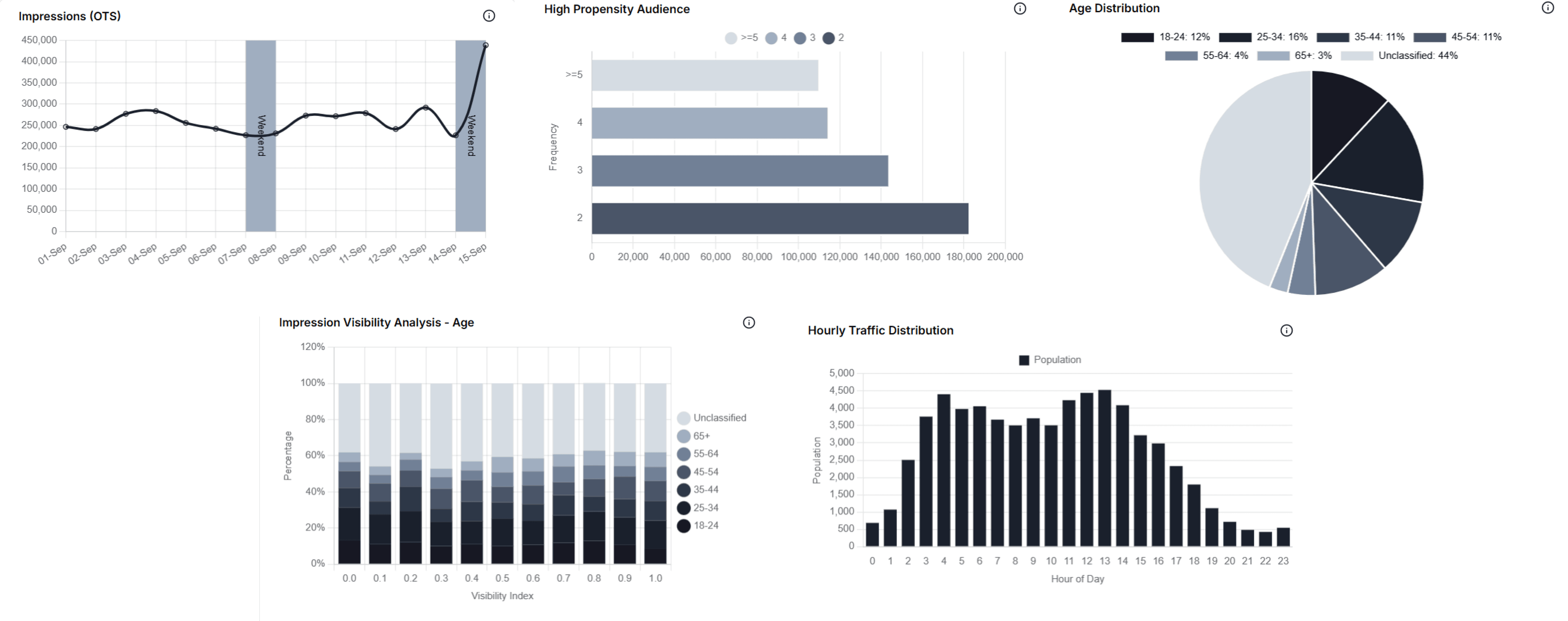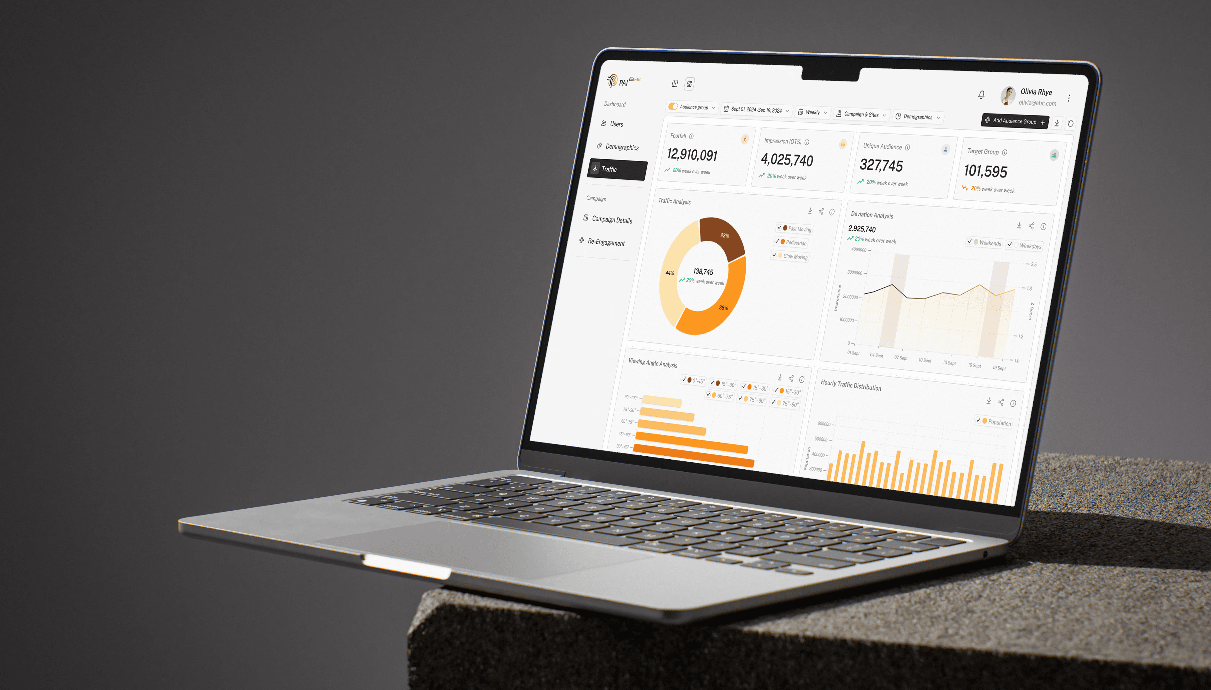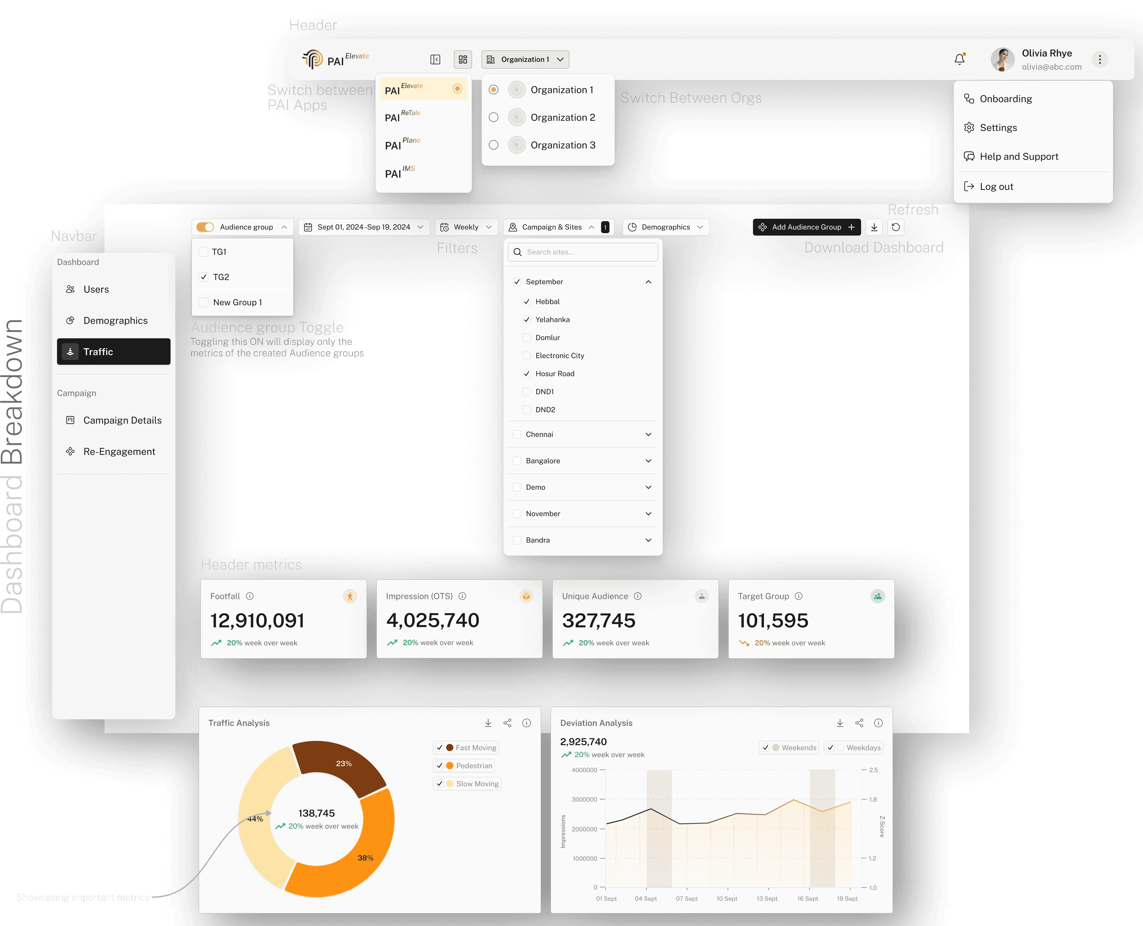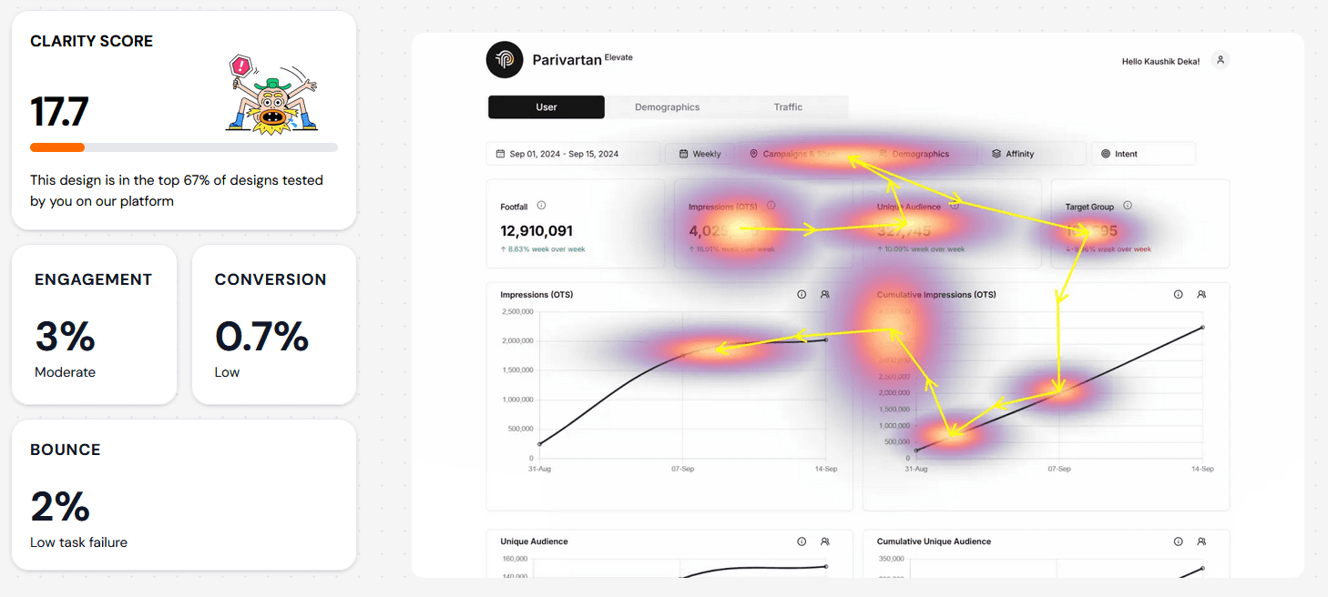 The information architecture of Parivartan Elevate is structured into three core tabs—Users, Demographics, and Traffic—each organizing campaign data into clear categories, with layered KPIs, charts, and filters for quick navigation. It enables users to move seamlessly from high-level campaign metrics to granular insights like visibility index, audience groups, and traffic patterns.
