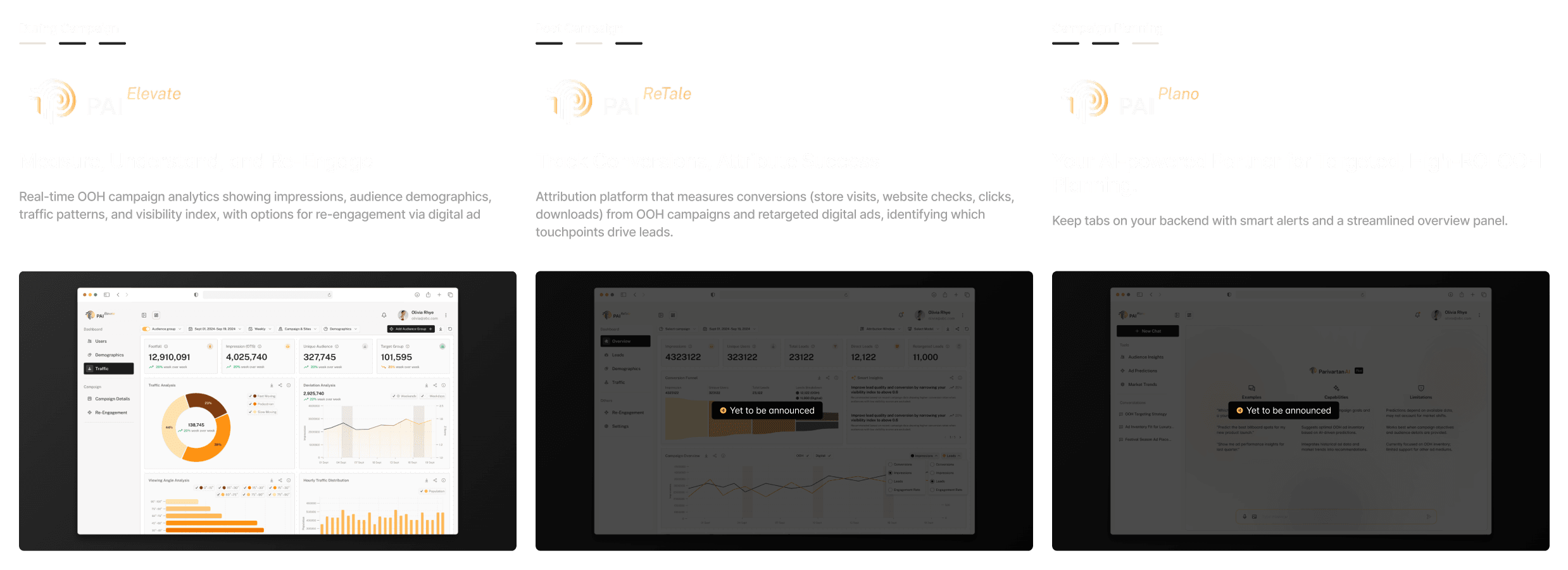 To be built around three core products — Elevate (real-time campaign analytics), ReTale (attribution and lead tracking), and Plano (AI-driven planning assistant). ReTale and Plano are still in the product planning phase and their design & development has not begun at the time of this case study.