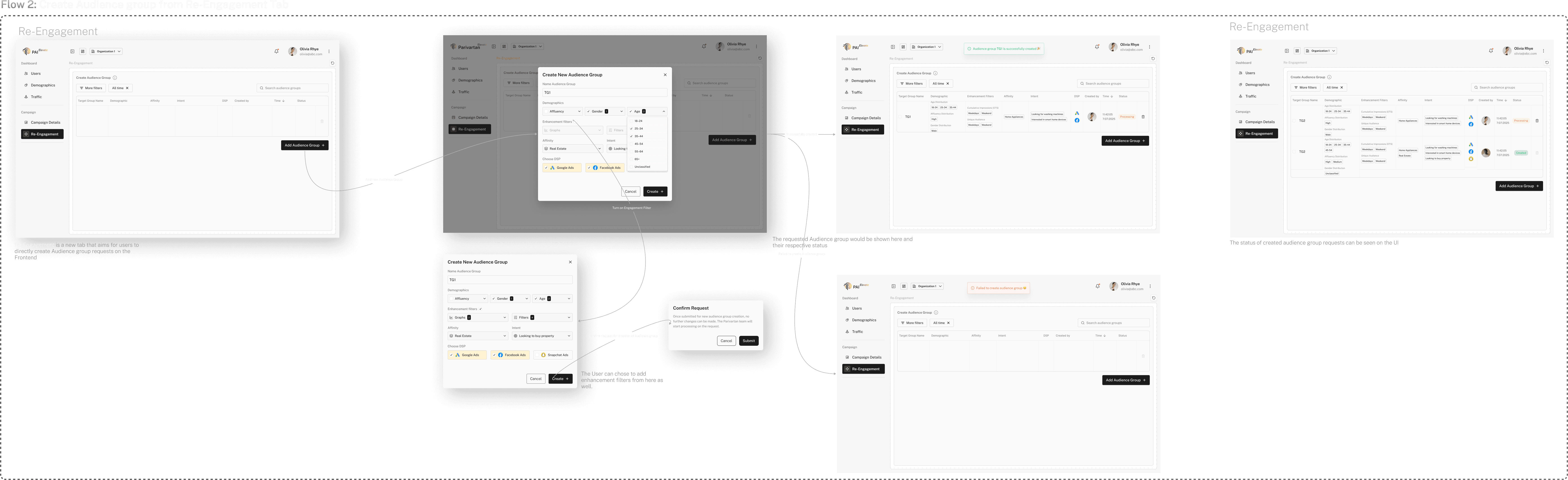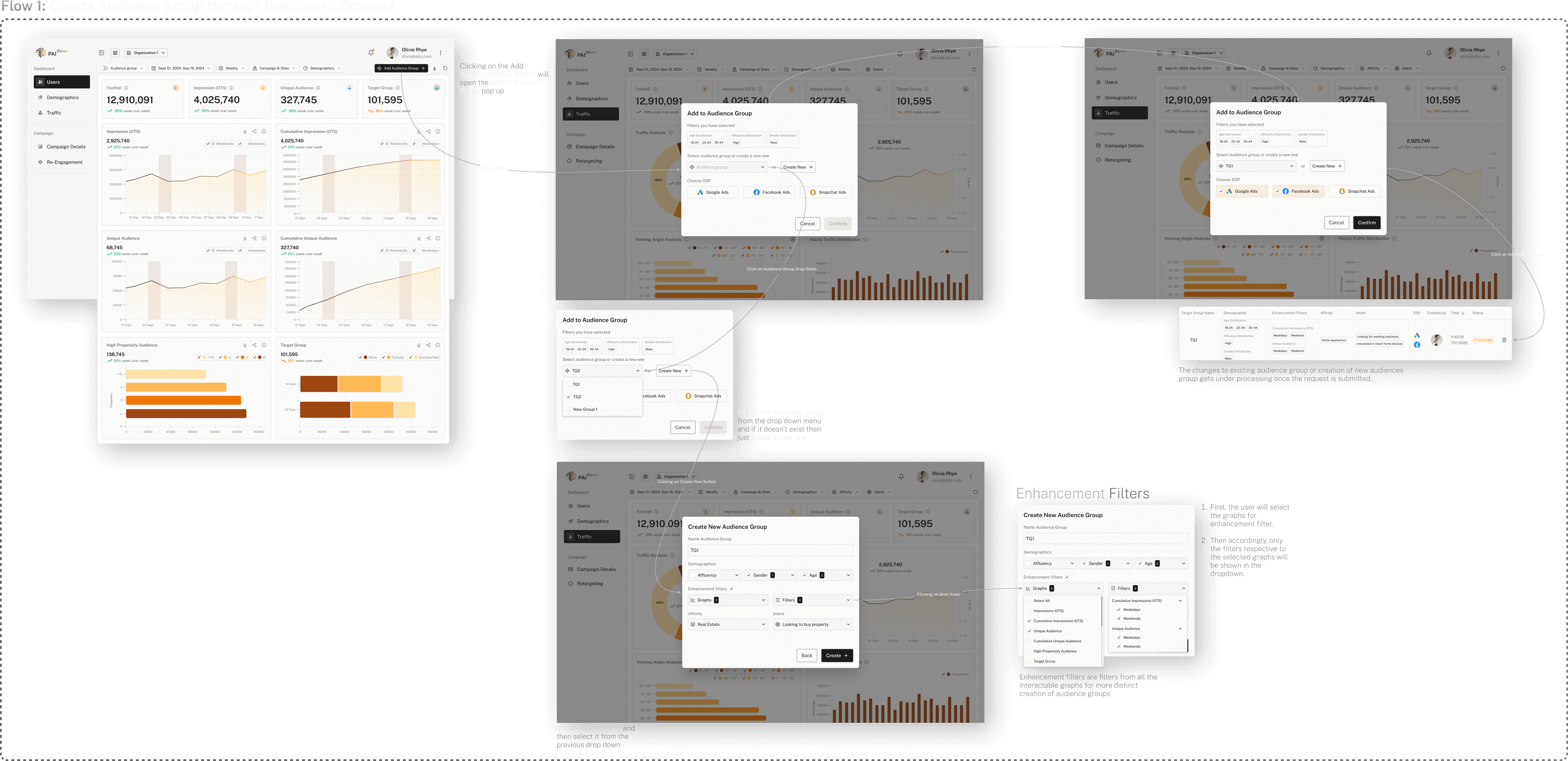 Streamlined target audience creation by consolidating it two independent flows within the Elevate dashboard. Instead of submitting separate requests for each graph, users can now define audience groups once using unified filters (age, gender, affluency, visibility index, etc.) and apply them across multiple graphs simultaneously. This reduced redundant backend calls, simplified multi-group retargeting, and significantly improved both user efficiency and tech team workload.