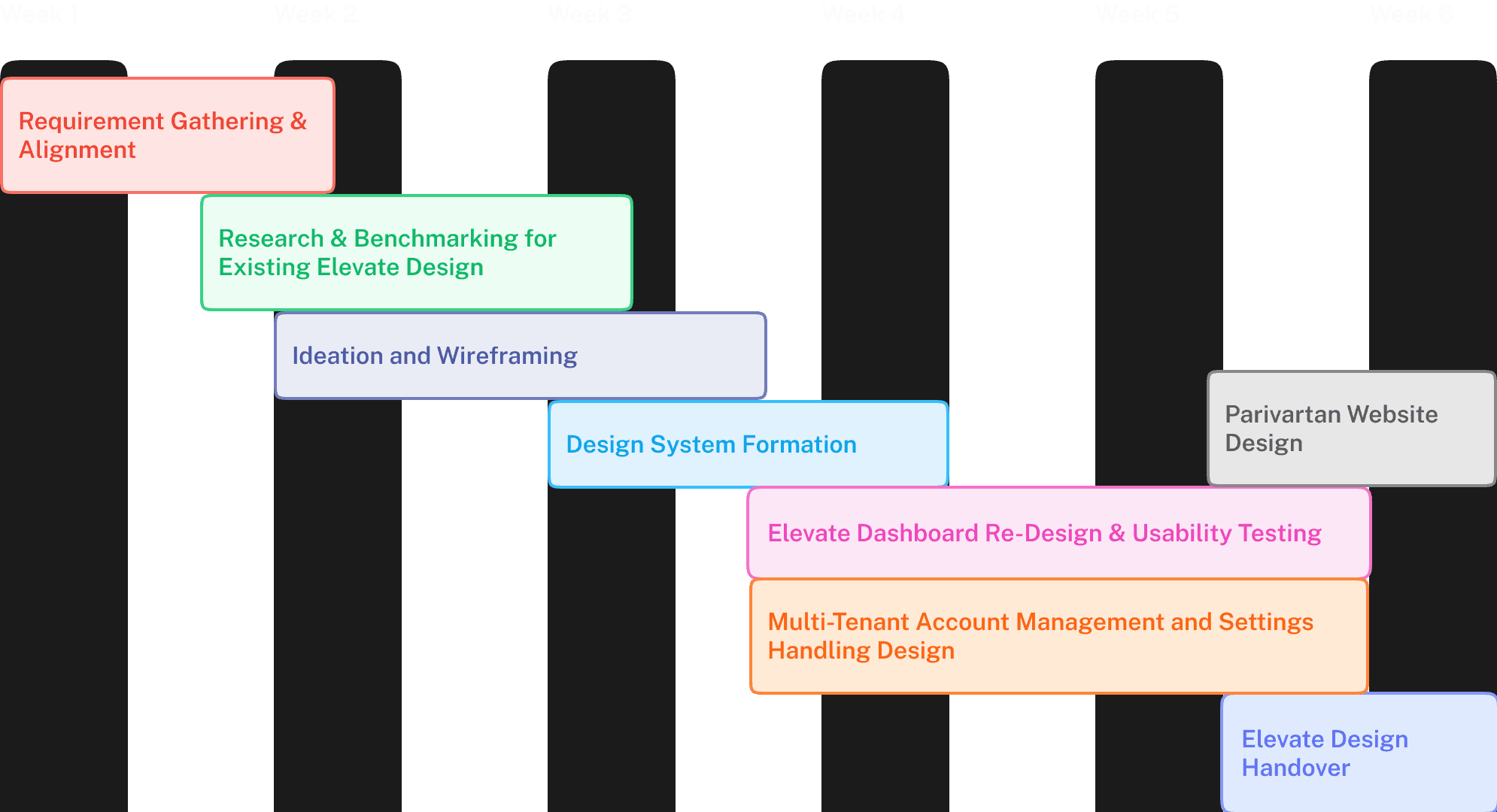 The whole project took about 6 weeks from requirement identification till design handover. This chart contains all the steps which were instrumental to the problems that were being solved with the redesign.