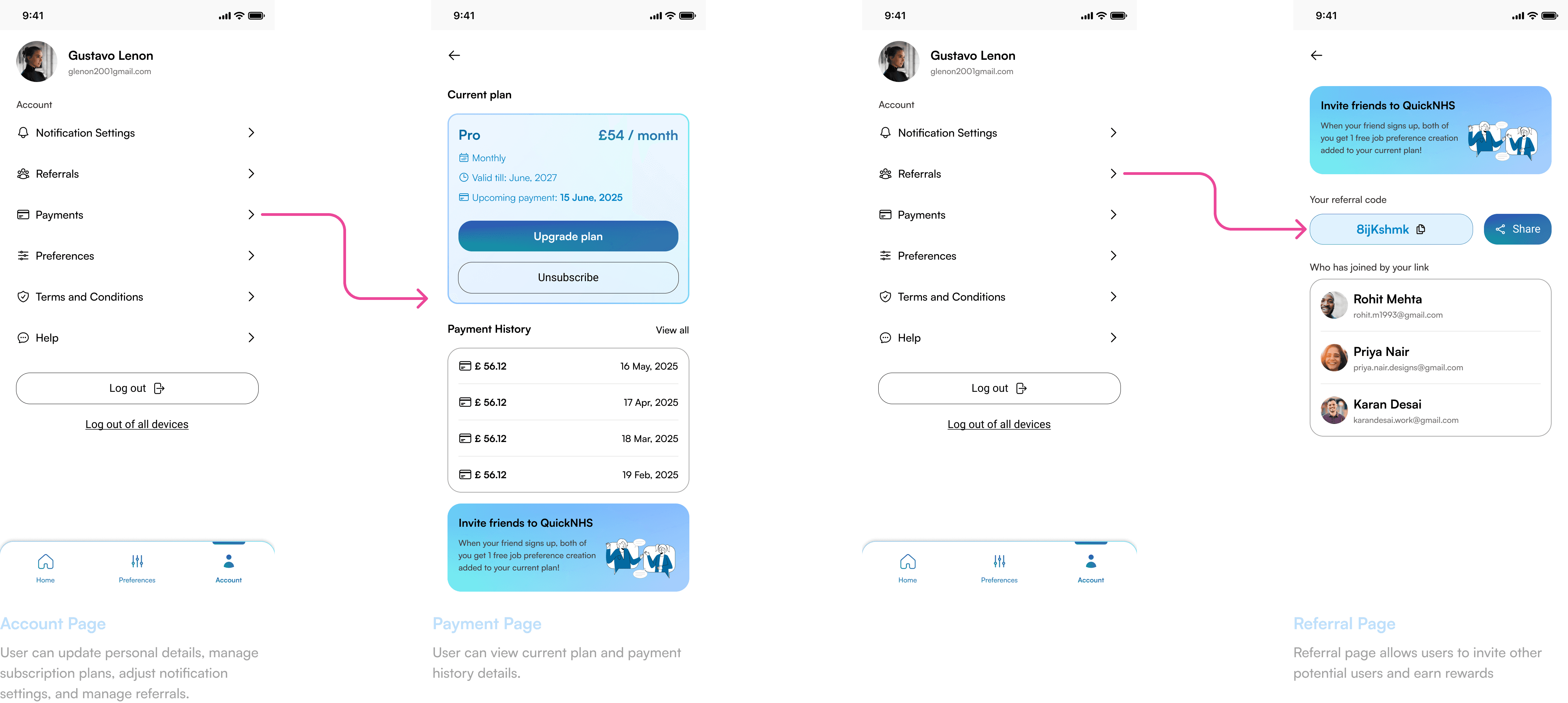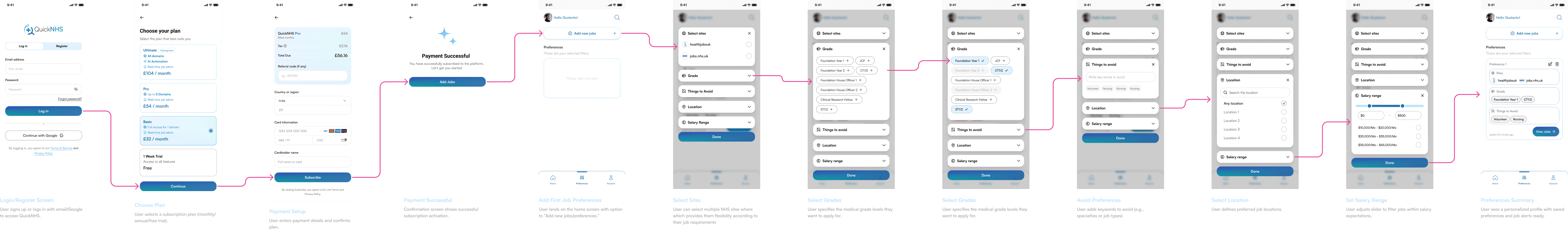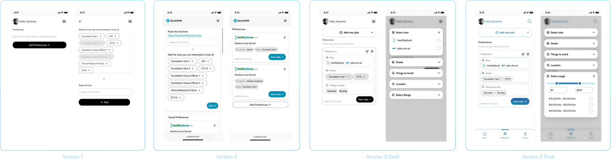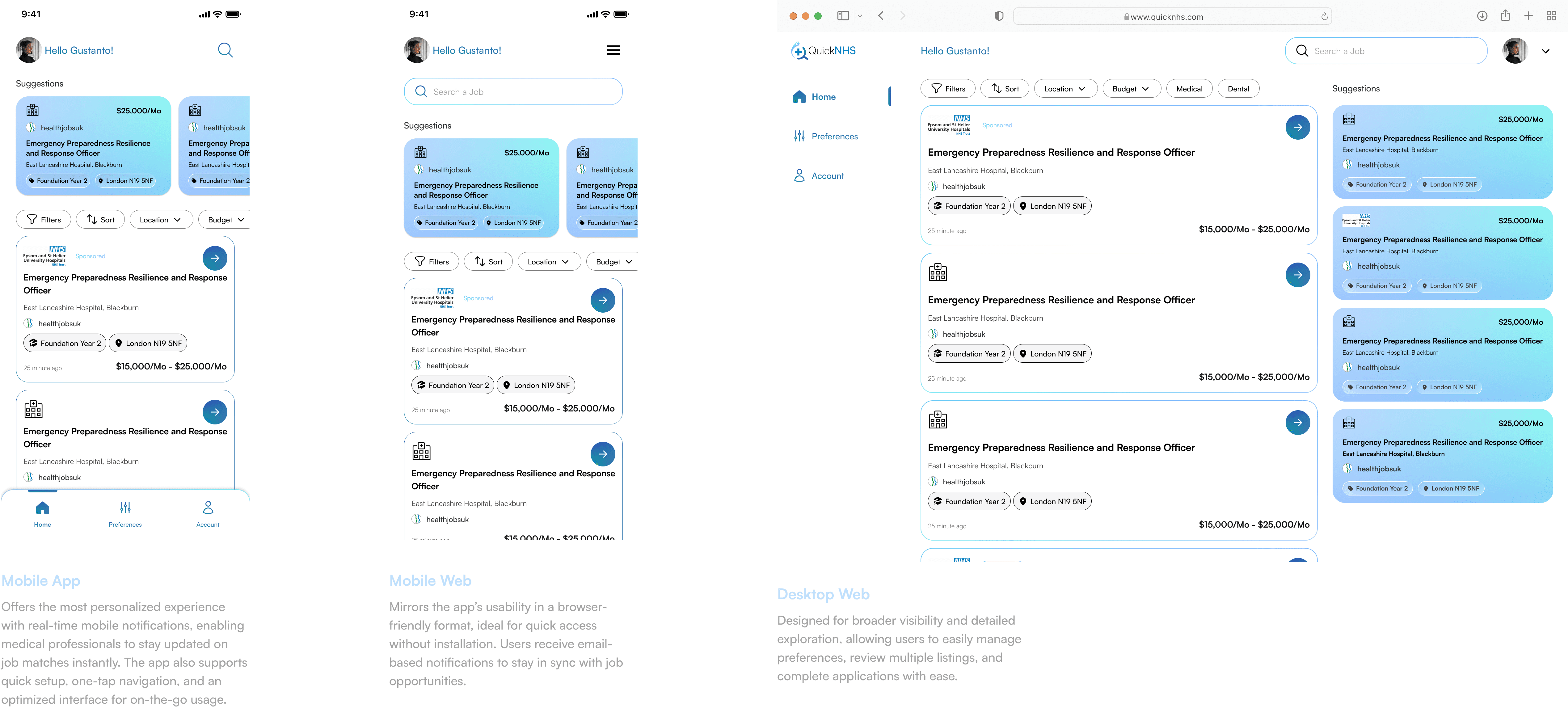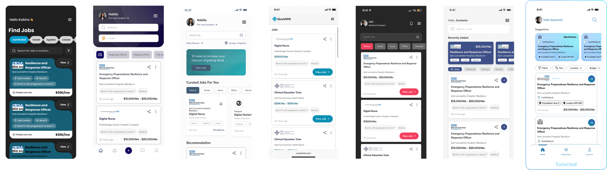 QuickNHS went through several design iterations to achieve a balance of clarity, trust, and speed. Early wireframes focused on simplifying job discovery and preference setup, while later prototypes refined job card layouts, filters, and notification flows. Feedback led to improvements in readability, color accessibility, and mobile-first navigation, ensuring busy healthcare staff could act quickly. The final UI emerged as clean, intuitive, and efficient, shaped by continuous exploration and user validation.