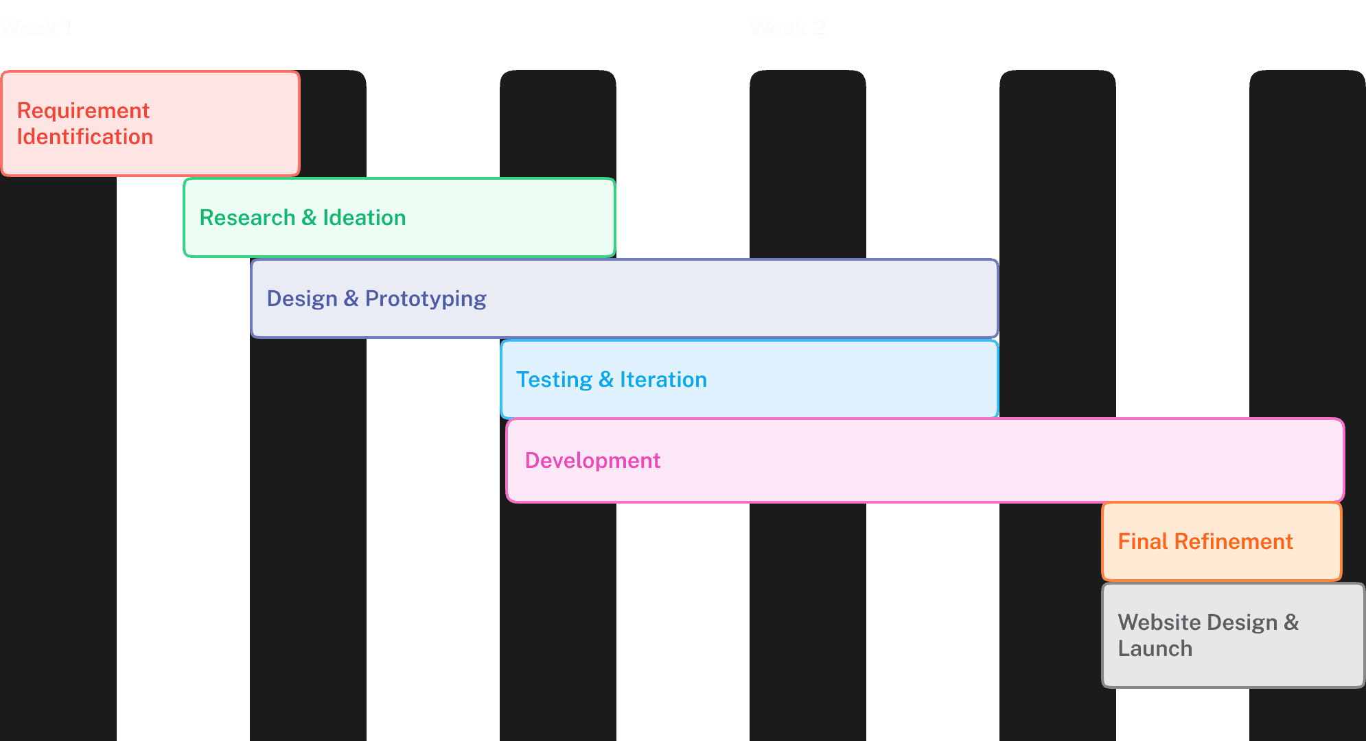 The whole project took about 2 weeks from requirement identification till launch of MVP. This chart contains all the steps which were instrumental to the product development lifecycle.
