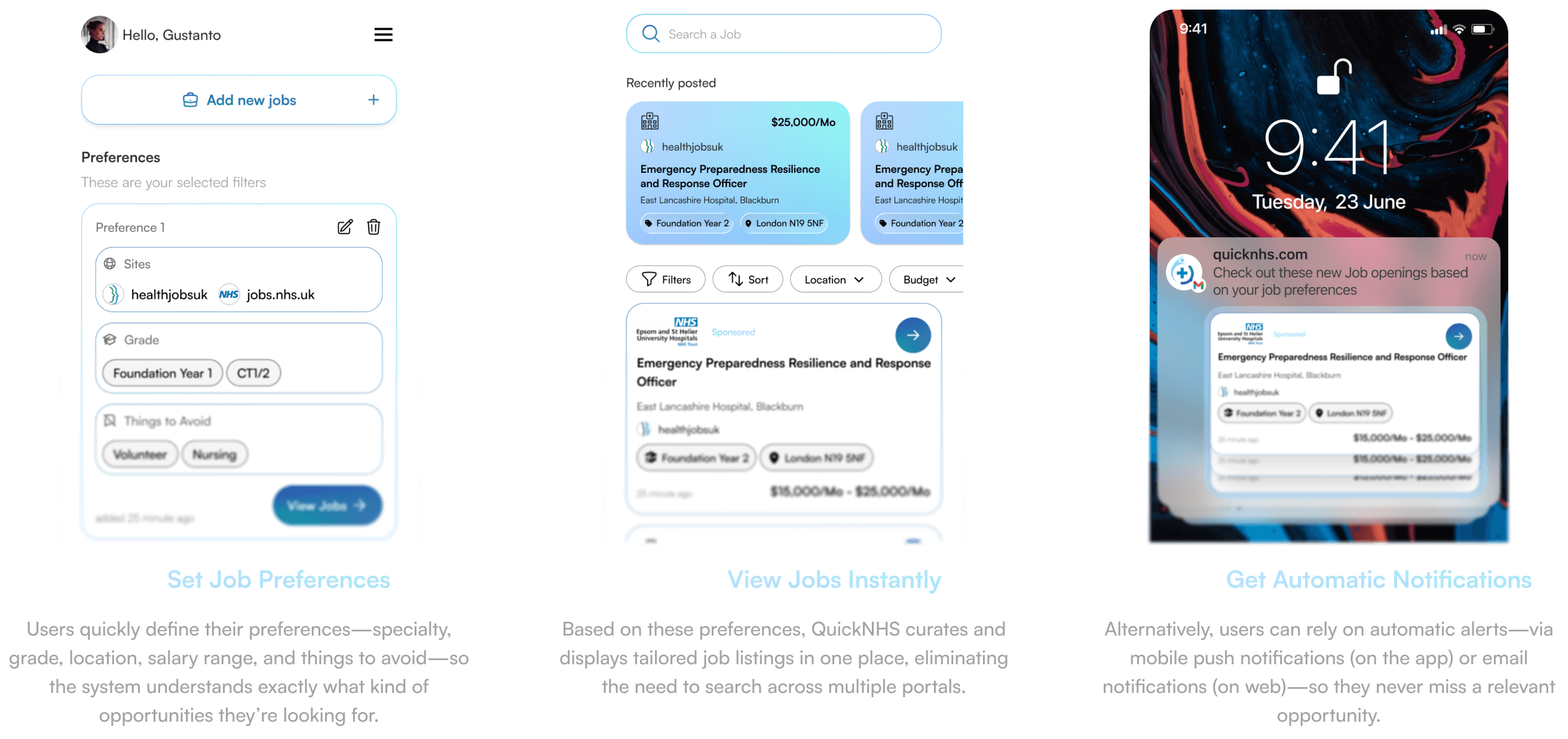 QuickNHS is designed to work in two simple steps for seamless job hunting and notification based on preferences.