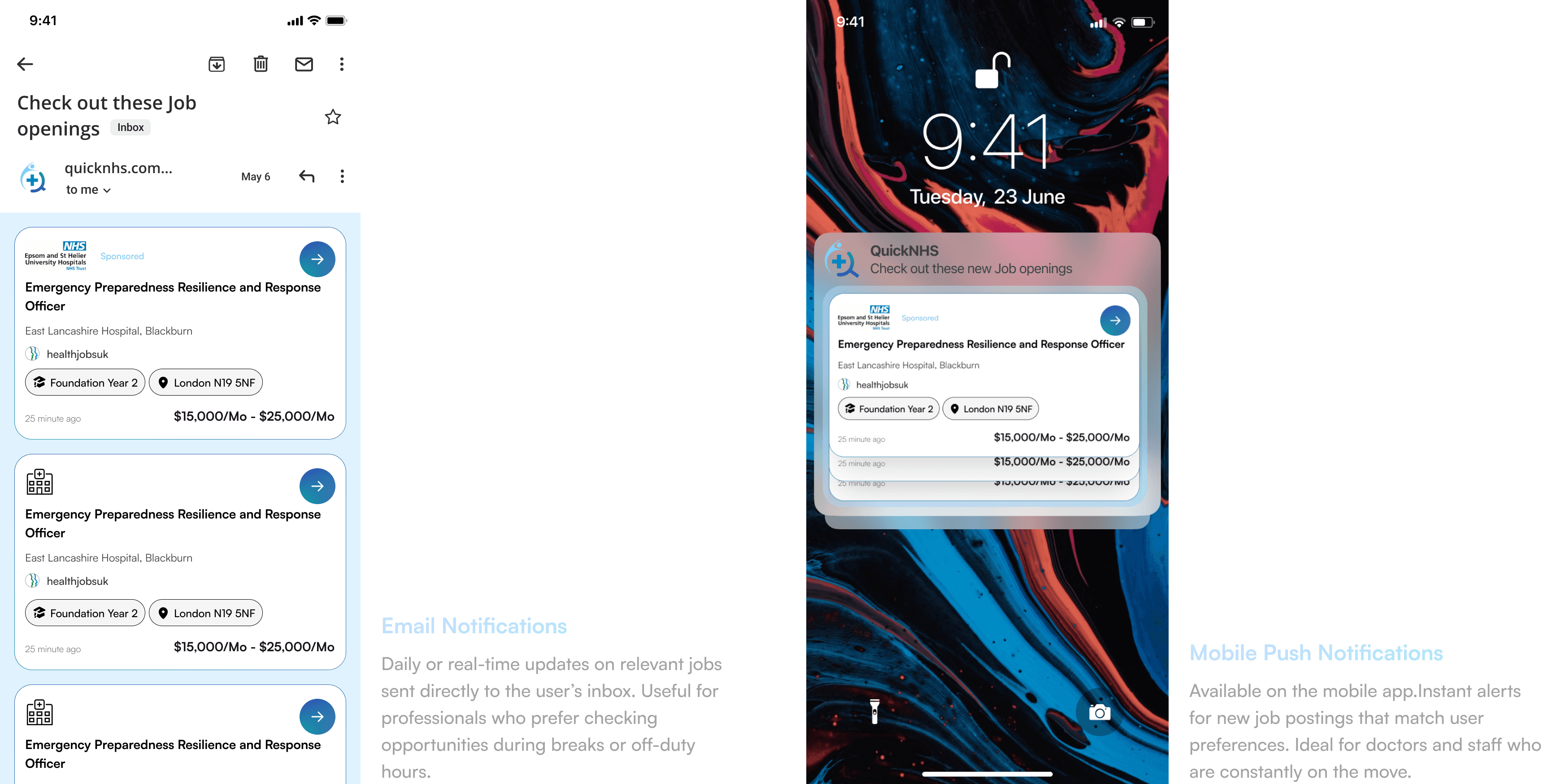 Doctors, nurses, and healthcare workers in the UK rely heavily on the NHS for career opportunities. But NHS job hunting is scattered across multiple portals like NHS Jobs and Trac Jobs, making it inefficient and stressful. Missing postings or being late to apply can directly impact career growth. QuickNHS was designed to solve these pain points by providing a real-time, centralized alert system.
