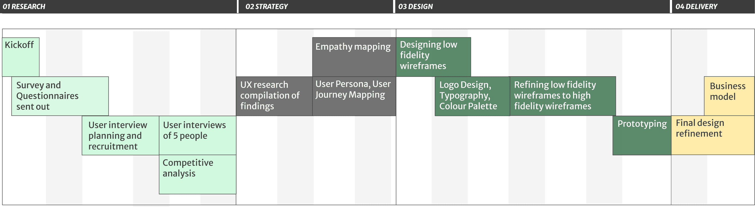 The whole project took about 4 weeks to complete from research till final design. This chart contains all the steps which were instrumental to the design process.
